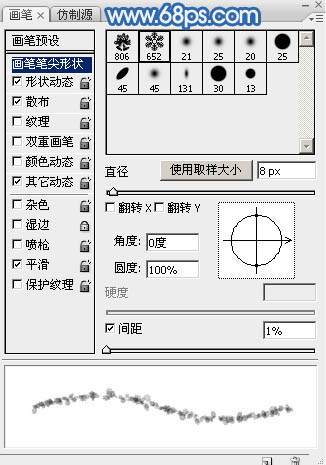 12、按F5调出画笔预设面板,设置:画笔笔尖形状、形状动态、散步、其它动态,参数设置如图16 - 19。同时勾选“平滑”选项。