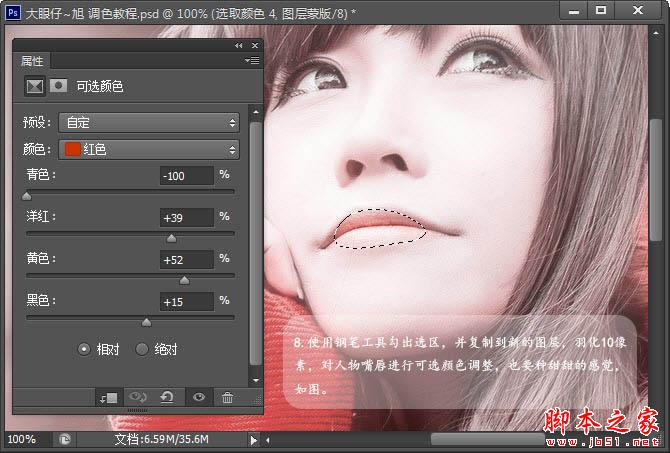 8、使用钢笔工具勾出选区,并复制到新的图层,羽化10像素,对人物嘴唇进行可选颜色调整,也要种甜甜的感觉,如图。