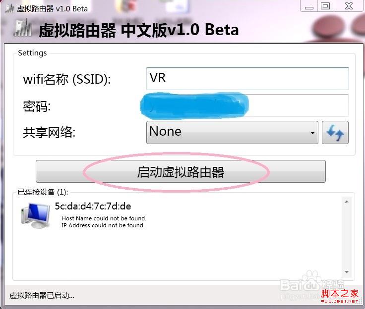 设置SSID为自己喜欢的,设置密码为8位以上字母英文等,点”启动虚拟路由器“,如下图: