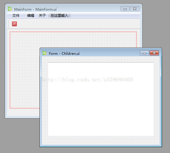 我们通过Qt Designer设计两个窗口,命名为主窗口(MainForm)和子窗口(ChildrenForm)。我们在主窗口的空白中央添加一个栅格布局并命名为MaingridLayout,等会需要将ChildrenForm放进去。