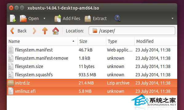 找到内核文件和initrd映像。如果你正在使用Ubuntu ISO文件,你会在casper文件夹中找到这些文件——vmlinuz文件是Linux内核,而initrd文件是initrd映像。后面,你需要知道它们在ISO文件中所处的位置。