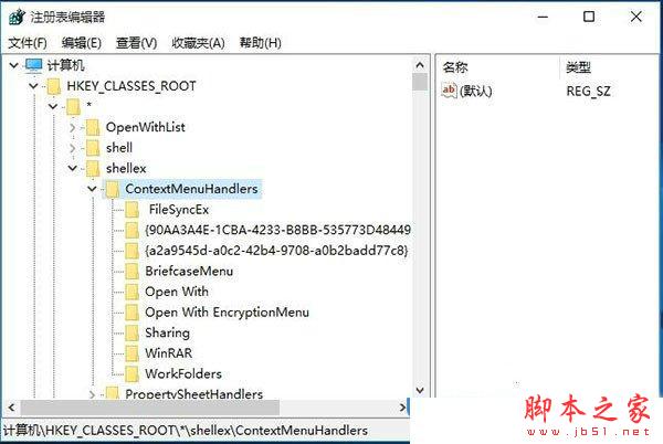 3、展开注册表项HKEY_CLASSES_ROOT\*\shellex\ContextMenuHandlers,删除可疑项;