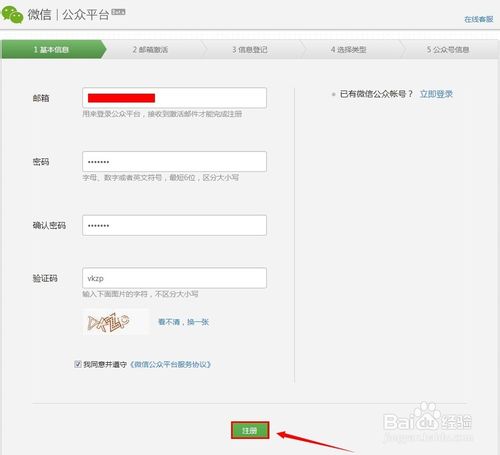 输入你要的邮箱地址,和登陆微信公众平台的密码。点击【注册】