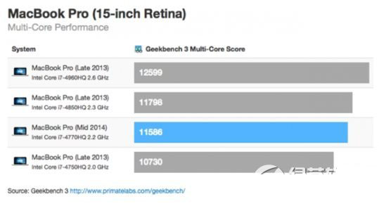 苹果昨天推出了5款新的视网膜版MacBook Pro,包括3款13寸和2款15寸产品,现在新款15寸低配版的性能跑分结果已经出现在Geekbench数据库。