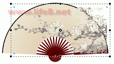 而原来的位图我们就不再需要了,将其删除即可。然后把这张转换后的矢量图全部选中后进行“修改—组合”,并移到折扇的上面来。双击该水墨图即可出现八个控制手柄,我们通过移动、伸拉等方式将该图摆放到扇面上的最佳位置。如图14