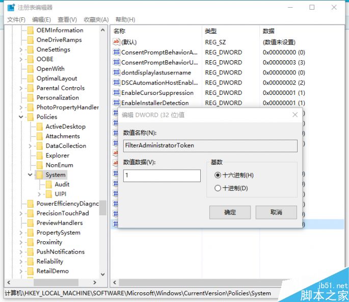在右侧找到FilterAdministratorToken项,如果没有就新建一个DWORD(32位),命名为“FilterAdministratorToken”,将它的数值数据更改为“1”,其他的不动,重启电脑后就行了。
