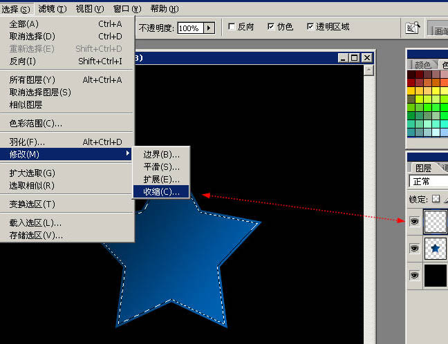 4、保持选区,选择菜单 【选择】-【修改】-【收缩】,在弹出的对话框里选择3px。