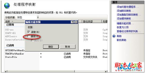 经过再三研究终于找到如何将windowns2008 iis7如何取消目录执行权限的方法,图解如下: