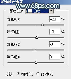 8、创建可选颜色调整图层,对红、黄、绿、白进行调整,参数设置如图18 - 21,效果如图22。这一步把图片中的绿色调淡一点,高光区域增加淡青色。