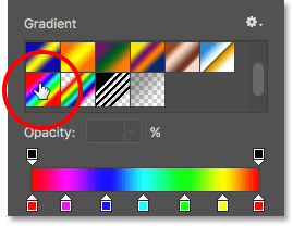 点击选择填充类型为渐变后,在填充类型设置面板中,滚动选取示例样式,找到彩虹渐变并选择上。如果已经开启Photoshop工具提示的话(默认开启),当鼠标悬停在图标上方时就会显示渐变样式的名称。