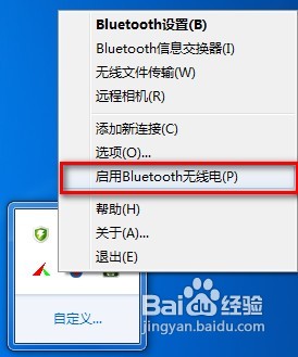 1、点击桌面托盘中的蓝牙符号。此时蓝牙符号为红色符号,表明未启动蓝牙。右键点击该图标启用蓝牙。此时蓝牙图标变成了蓝色