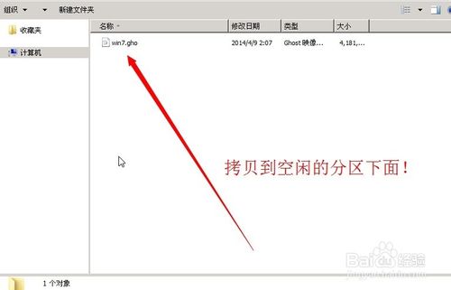 1、下载后进入PE系统。用U盘把gho文件(你的是ISO文件的话里面最大的文件就是gho问件了)拷贝一份到硬盘的最后一个分区里面。比如我拷贝到D盘。还原的时候选择还原到C盘。