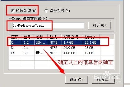2、下载本文上面提供的最新版本的onekey,打开刚才你复制到最后一个分区的gho文件。我的gho文件是拷贝到的路径是:D:\media\win7.gho,选择的是蓝色阴影的C盘。