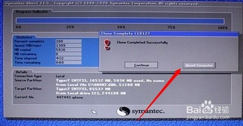 4、 还原文件完成后点击“reset computer ”提示重启你的电脑。以便进行下一步的安装