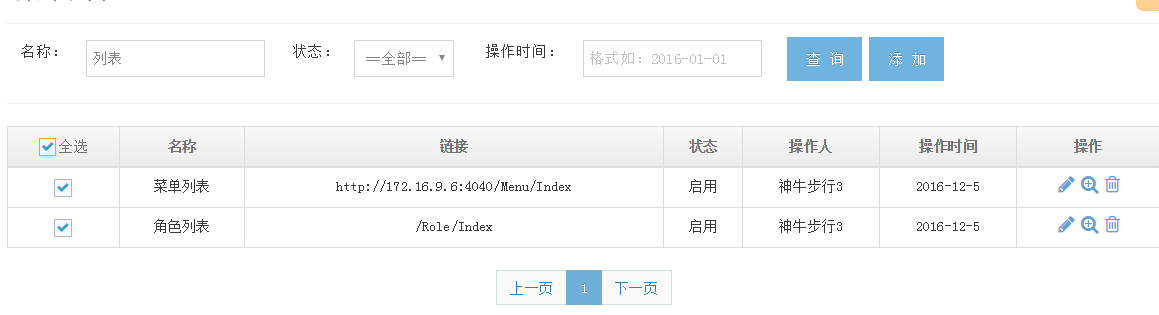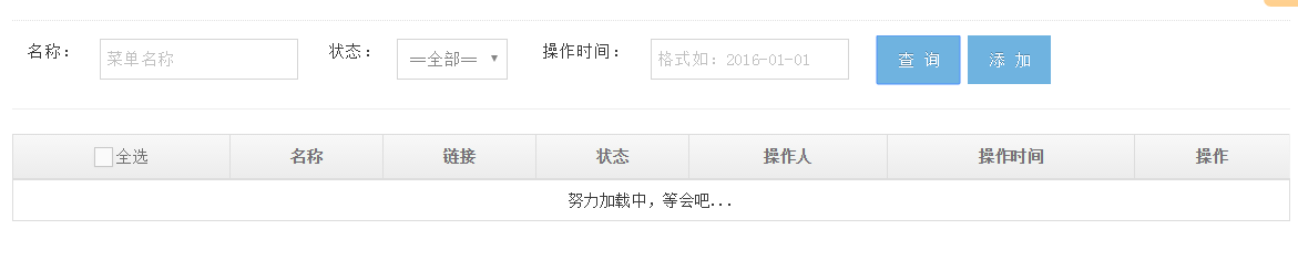 再来,咋们就开始使用shenniu.pager.js,我们需要在点击“查询”按钮的时候去调用这个插件,然后通过插件去获取后台接口返回的数据,并绑定到页面展示出来,所以有了如下代码: