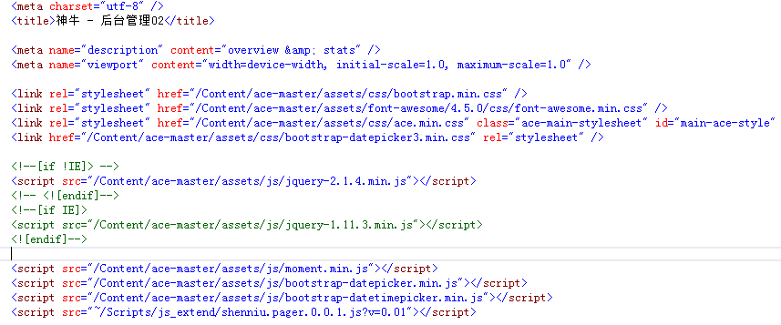 首先,为了页面样式好看我使用了bootstrap+ace样式框架,样式效果就是如上面几张图所示(这里是样式和js文件);由于该插件是采用jquery格式书写的所以需要引用jquery.js,如上面图所示使用到了日期选择框,因为我采用的样式都是基于h5的设计所以这里引用的日期选择插件bootstrap-datepicker.min.js和她的样式bootstrap-datepicker3.min.css;该实例需要的引用文件都好了,下面看下截图: