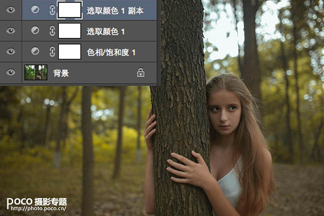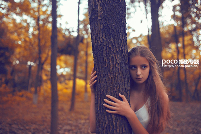 素材图片为树林绿色,调色的时候可以逐渐把绿色转为橙黄色,暗部区域可以增加一些蓝色或蓝紫色增强层次感,最后适当美化一下人物即可。