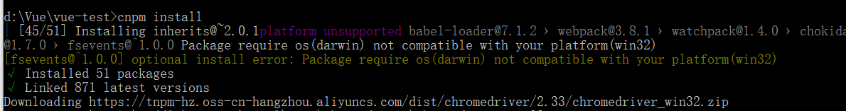 8.cd到我们的项目文件夹d:Vuevue-test中,运行命令cnpm install 安装包。