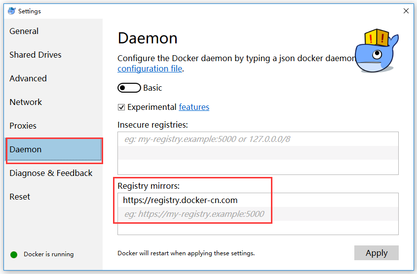 点击托盘处docker图标右键选择-Settings,然后修改如下:
