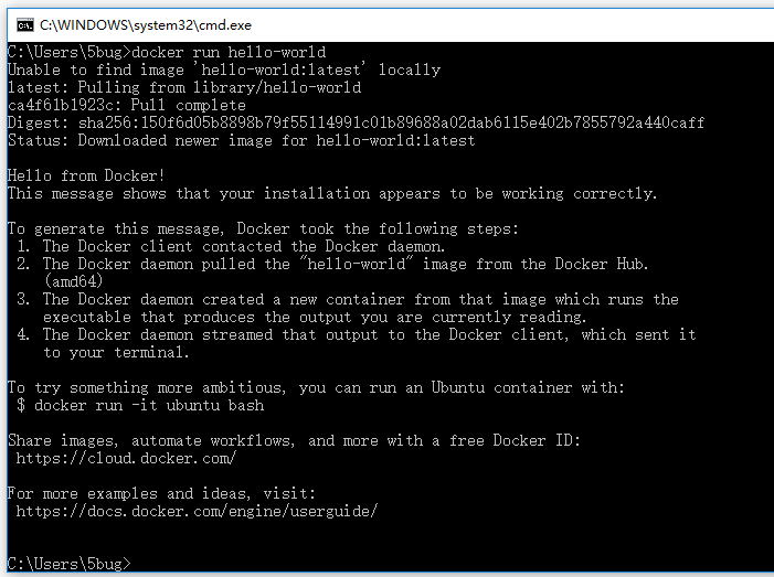 输入命名“docker run hello-world”可以加载测试镜像来测试。如图: