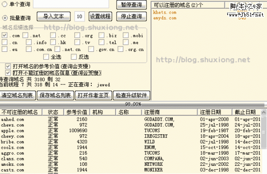 目前已经完成前面三项,正在查询第四项,*结果发现前面三项全部被注册,第四项已经查询完1/3,只有khets.com和emyds.com没被注册