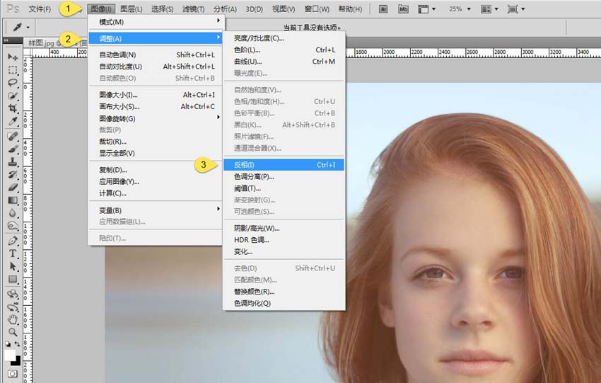 第六步:上一步操作之后,画面变得灰蒙蒙的,别担心,选择【图像-调整-反相】,画面又会变回正常了。