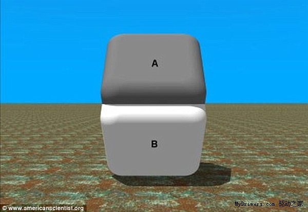 这也是个经典的视错觉。A、B区域看起来一个深灰一个浅灰,但这是周围光线和颜色影响的结果,其实它俩的颜色是相同的。