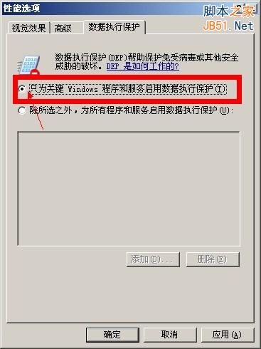 选择 只为关键 windows 程序和服务启用数据执行保护,保存后重启电脑就可以了,有时候发现无法选择那么就可以参考这篇文章了(http://www.uoften.com/os/windows/136308.html)。