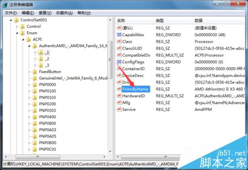 5、最后对FriendlyName里的名字进行任意修改,这是对cpu的名字进行任意修改,下面1至...里的每个FriendlyName修改的名字都一样