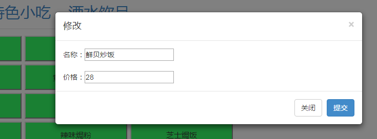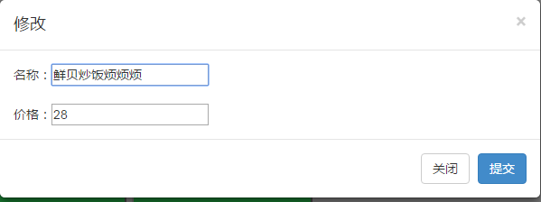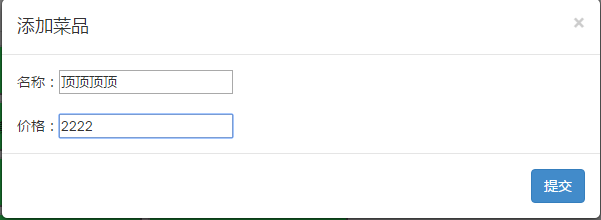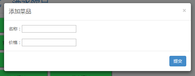 <div id="tianjia" data-toggle='modal' data-target='#myModall'>添加菜品</div> <div class="modal-content"> <div class="modal-header"> <button type="button" class="close" data-dismiss="modal" aria-hidden="true">×</button> <h4 class="modal-title" id="myModalLabel">添加菜品</h4> </div> <div class="modal-body" id="content"> <div id="name">名称:<input type="text" id="ming"/></div> <br /> <div id="price">价格:<input type="text" id="jia"/></div> </div> <div class="modal-footer"> <button type="button" class="btn btn-primary" id="tijiao1">提交</button> </div> </div>