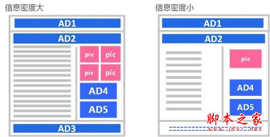 以列表页作为研究对象,信息密度的两个考察指标:留白和广告数。左侧页面信息密度>右侧页面信息密度。