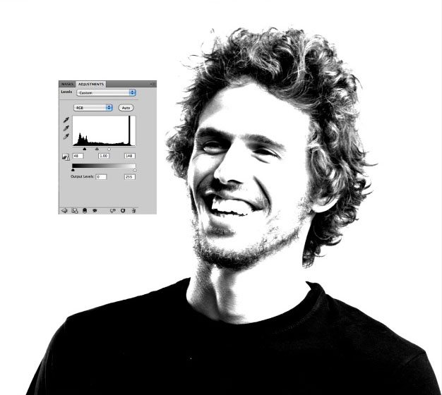5、撤销一些设置,将图片还原到第二步的状态,将它存储为me.psd。进入Photoshop菜单,使用”图像>调整>色阶”,使用下面设置。