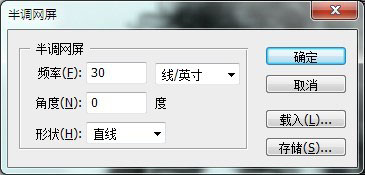 7、接着我们需要设置半调网屏的参数,频率使用“30 线英寸”,角度“0”,形状“直线”。同样,你也可以根据你想要的效果设置不同的参数。