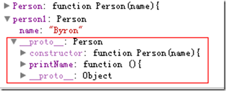 Person的实例person1中包含了name属性,同时自动生成一个_ proto _属性,该属性指向Person的prototype,可以访问到prototype内定义的printName方法,大概就是这个样子的: