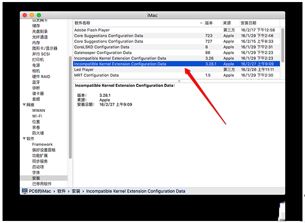 首先,无法通过有线网络上网的Mac 用户可以进入“关于本机”——“系统报告”——“软件”——“安装”中查看,是否有一项版本为3.28.1的安全更新,如图所示: