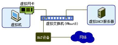 vmnet8:他是NAT连接模式使用的方式。从主机的虚拟网卡出来,链接到vmnet8交换机,虚拟交换机的其他口连接到NAT设备,另外一个连接DHCP服务器,其他接口连接虚拟机。