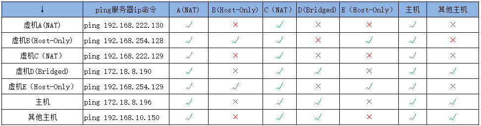 那么接下来我们就相互ping一下,看下各种模式的网络连接情况,如下表: