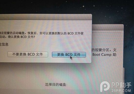 4. 将Win.winclone镜像文件恢复到第三步所说的Win盘,这时候我们会看到一个选择更改BCD文件(通过不同的BCD文件来实现直接启动不同的系统)的选项,然后Winclone会自动调用Boot Camp软件来修改Mac的启动盘。