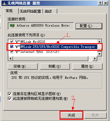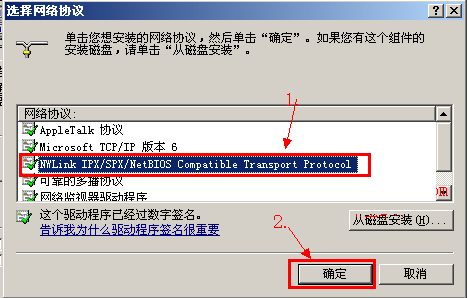 第5步:在网络连接中单击选中“NWLink IPX/SPX/NetBIOS Compatible Transport Protocol”,再单击确定按扭。