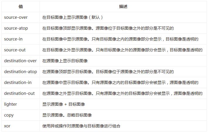 •globalCompositeOperation: 设置或返回新图像如何绘制到已有的图像上,该方法有以下属性值:
