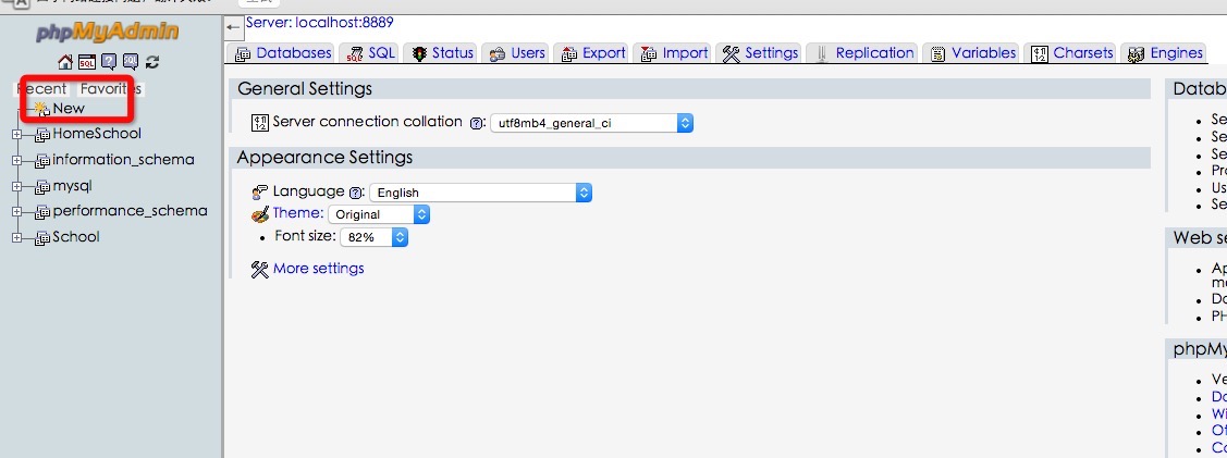 (1)打开MAMP并单击Start Servers(也许需要输入mac的用户名及密码),使用浏览器访问http://localhost/phpmyadmin,将出现如下的接界面新建数据库