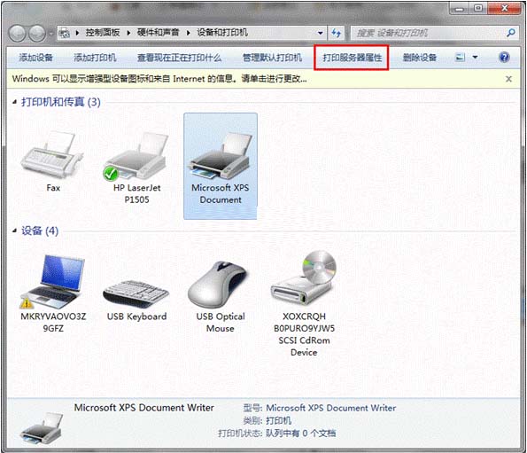 1.开始-设备和打印机:随便选择一个打印机图标,选择打印机服务器属性;