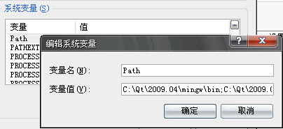 注意PATH值的顺序也是有影响的。如果报出“无法定位程序输入点_Z5qFreePV于动态链接库QtCore.dll上”那就是这些路径的顺序出了问题,请查阅互联网上的文章,很容易解决的。