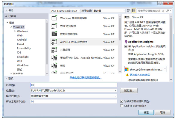 (1)打开Visual Studio 2017开发环境,然后依次点击文件→新建→项目,在弹出的新建项目对话框中选择“ASP.NET Web应用程序”选项,然后更改项目名称和项目路径,如图12.1所示。