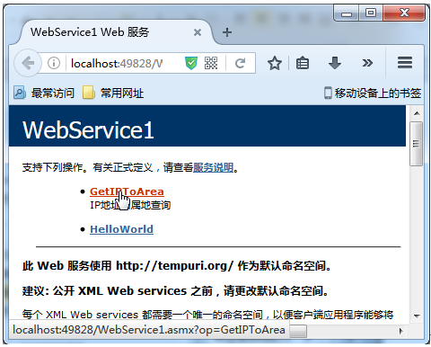 代码完成之后,接下就是调用这个服务,首先运行这个服务页面,这与运行Web页面相同,在弹出来的网页中包含了对于这个服务页面的说明,其中页面上有两个可点击的连接,该连接对应的是服务中定义的方法名称,一个是刚才定义GetIPToArea方法,并且带有方法描述信息,另一个则是创建服务页面时自动生成的测试方法,这里直接点击GetIPToArea方法连接,如图12.3所示。
