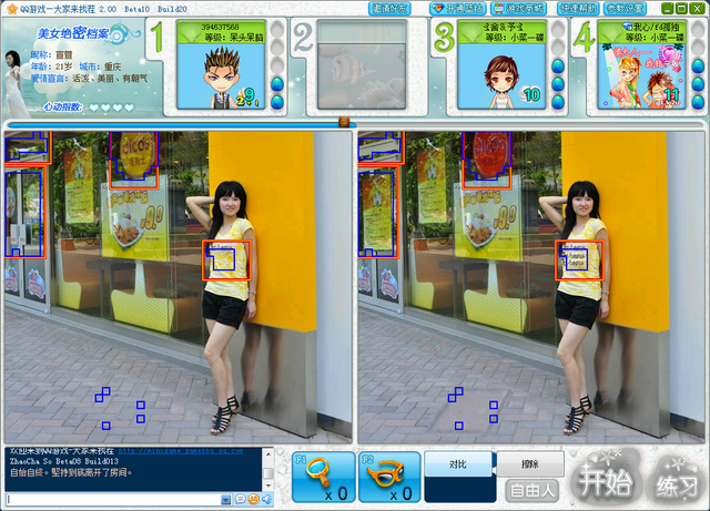 辅助工具在游戏中增加了两个按钮,点击“对比”则自动找“茬”,用蓝色小框标识,点击“擦除”清除标识。