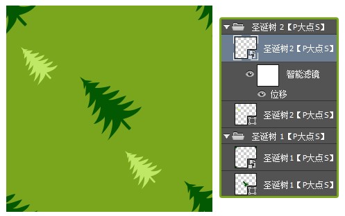 复制一层圣诞树图层,选择住两个圣诞树图层,CTRL+G创建图层组,为顶层的圣诞树执行位移滤镜设置水平向右、垂直向下各150像素,未定义区域为折回,效果如下: