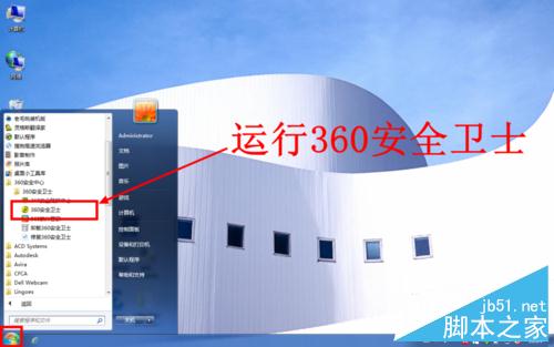 2、点击桌面左下角的“开始”(Win图标),在开始菜单里找到360安全卫士,运行改程序。