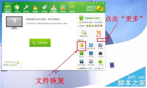 3、在360主界面右侧有一个功能大全的区域,该区域里有一个“文件恢复”工具,点击它,如果这儿没有,则点击功能大全旁边的“更多”。